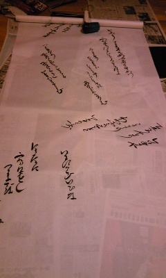 私はセットの壁紙用に障子紙に和歌を写す作業。